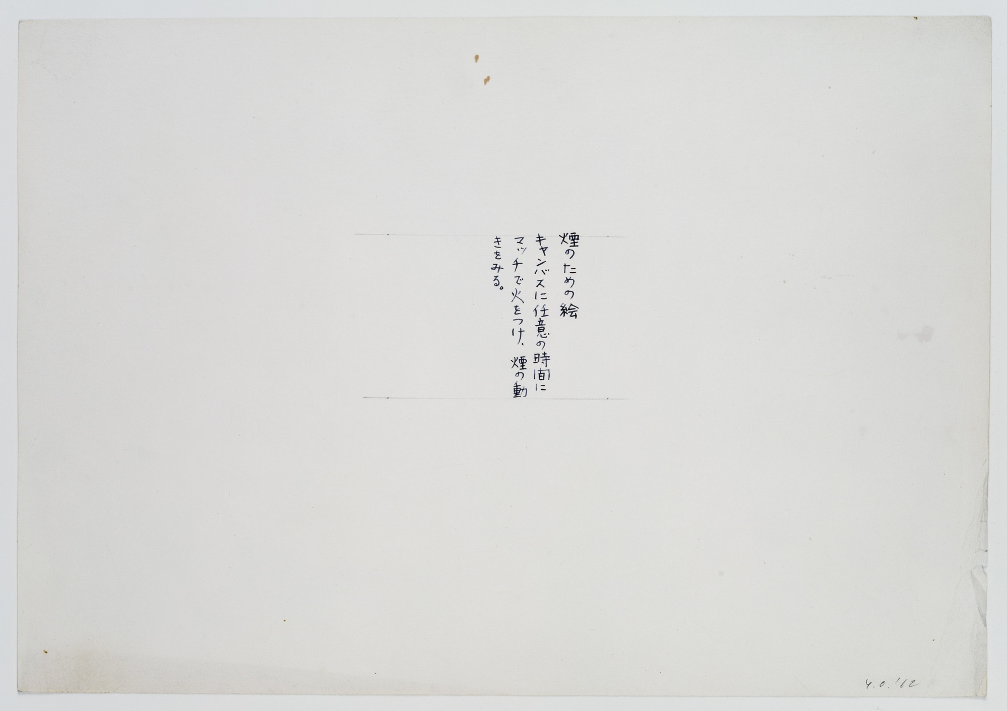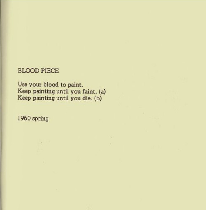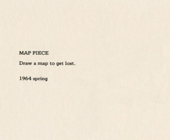 While LeWitt is one of the most well known artist to present instructions as art, there were many artists making similar work at the time, including some who made instructions that weren't ever really intended to be produced, like Yoko Ono. The piece above comes from the series "Instructions for Paintings" 1961/1962 consisted of 22 instructions, translated it reads “Painting for Smoke. At any chosen time, light a match on the canvas and watch the movement of the smoke.” Below are three more of her instruction pieces, mean to be contemplated more so than created.